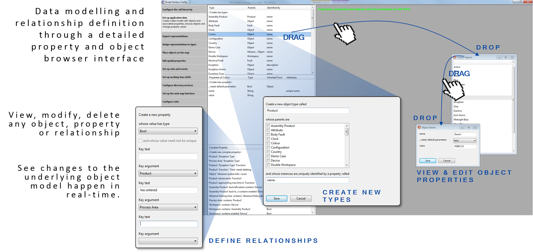 The Type and object definition feature includes a full development and object explorer thick-client GUI, which provides a drag-and-drop interface for creating new types, instantiating new objects, and interrogating and editing object properties and states.